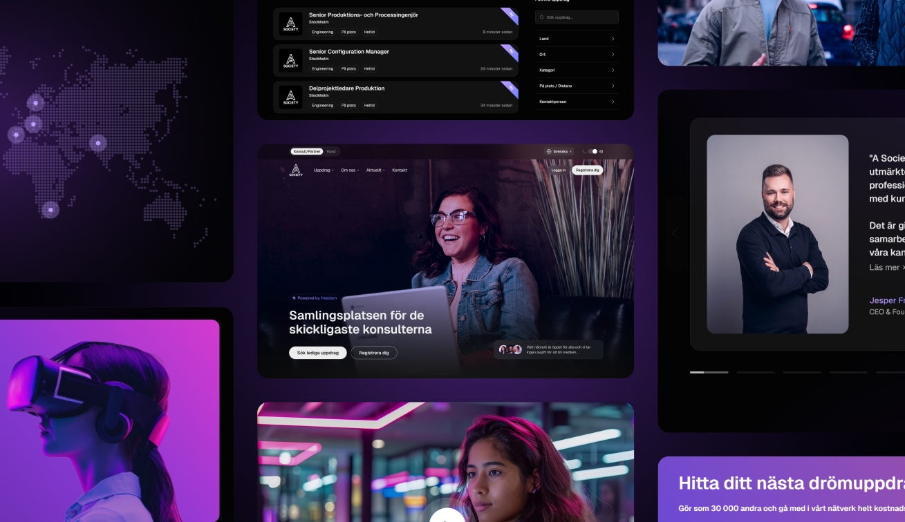 Den nya webbplatsen speglar A Societys varumärke och skapar en engagerande upplevelse för både kunder och konsulter. Plattformen är flexibel, lätt att underhålla och fungerar som ett effektivt verktyg för kommunikation och rekrytering. Vi fortsätter samarbeta med A Society för att vidareutveckla innehåll och funktioner i takt med deras tillväxt.